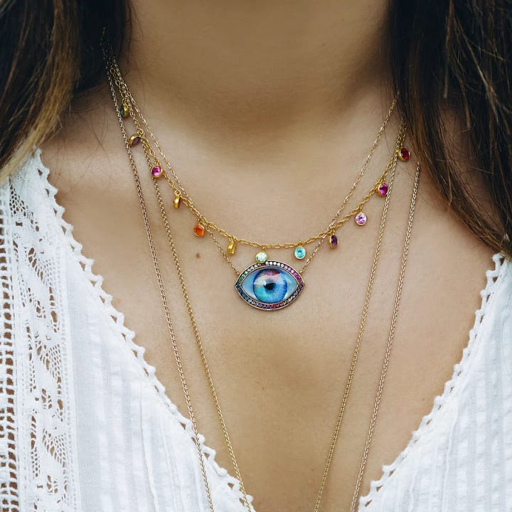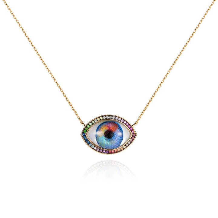 I have an eye in my house, in my car and even in my wallet. But if that’s not your thing, you could wear a psychedelic one around your neck. Noor Fares created this beautiful eye necklace with a personalised painting of your own eye.